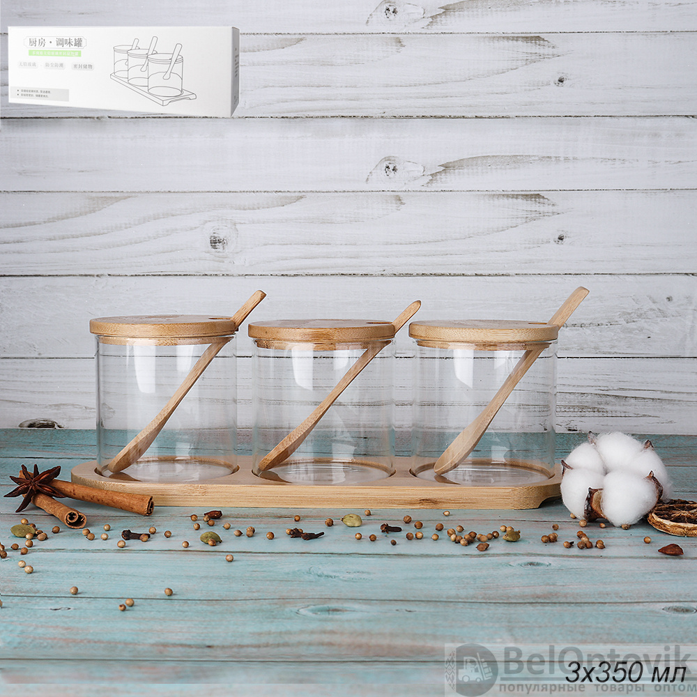 Банка для специй 3x350 мл с бамбуковой крышкой и ложками / GT-35-28 /уп 24/ на подставке