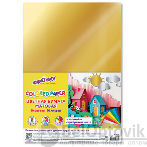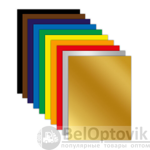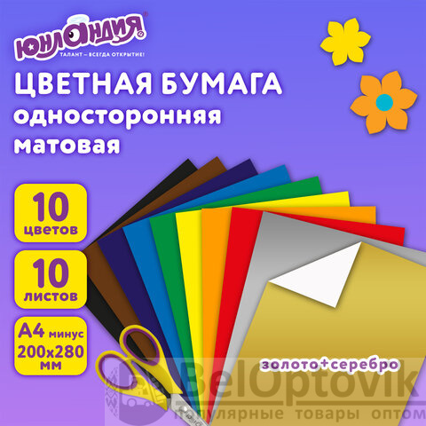 Набор офсетной (матовой) односторонней цветной бумаги плотностью 60 г/м2 включает 8 листов формата А4 (200х280 мм) в 8-ми разнообразных и насыщенных однородных цветах + 2 листа мелованной бумаги плотностью 90 г/м – золотого и серебряного цвета. Листы легко режутся и сгибаются.