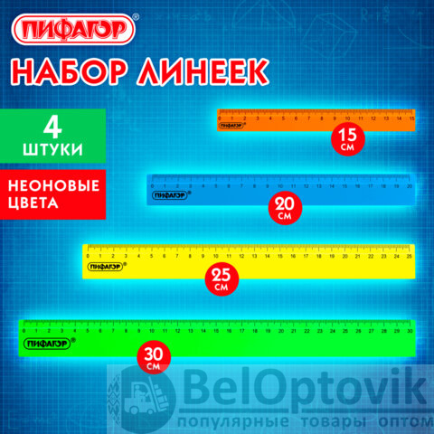 Линейки пластиковые 15, 20, 25, 30 см неоновые, ПИФАГОР, НАБОР 4 шт, непрозрачные, европодвес, 210906