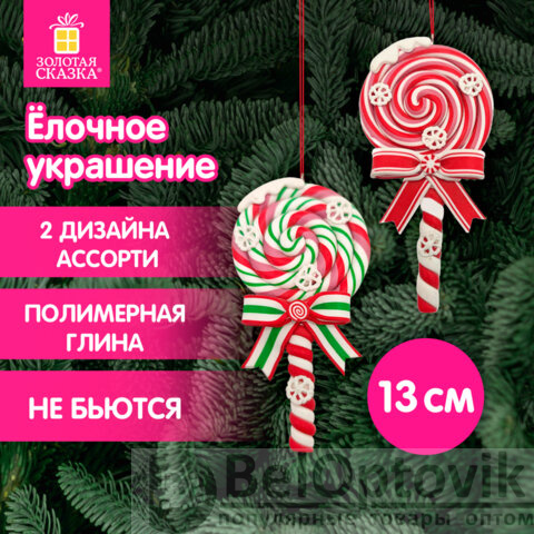 Украшение ёлочное (1 шт.) "Леденцы", 6,5х13 см, полимерная глина, ассорти 2 дизайна, ЗОЛОТАЯ СКАЗКА, 592407