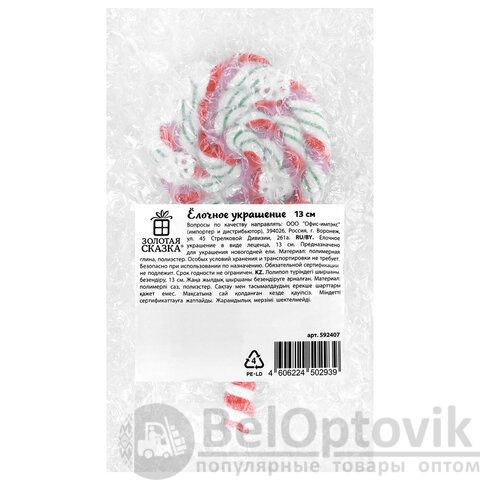 Размер украшения – 6,5х13 см. Материал – полимерная глина. Каждое елочное украшение имеет бумажную этикетку и упаковано в воздушно-пузырчатую плёнку для защиты от повреждений. Поставляется в 2 дизайнах (без возможности выбора).