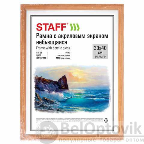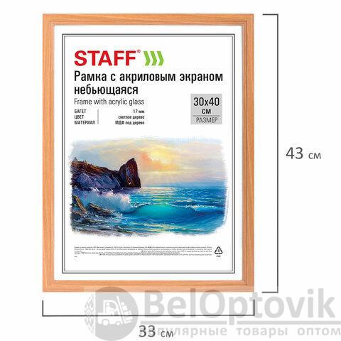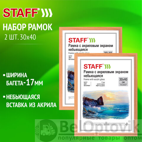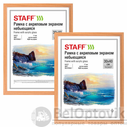Рамка 30х40 см небьющаяся, КОМПЛЕКТ 2 шт., багет 17 мм, МДФ под дерево, STAFF "Carven", цвет светлое дерево, 391327