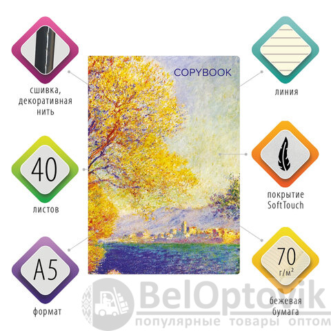 Тетрадь 40 л. в линию обложка SoftTouch, бежевая бумага 70 г/м2, сшивка, А5 (147х210 мм), КЛОД МОНЕ, BRAUBERG, 403794