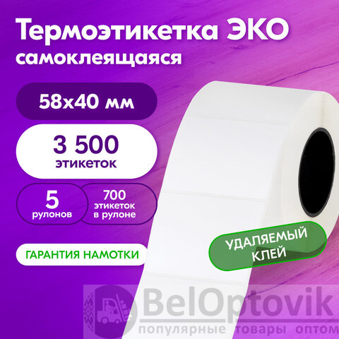 Этикетка ТермоЭко (58х40 мм) 700 этикеток в ролике, КОМПЛЕКТ 5 шт., УДАЛЯЕМЫЙ КЛЕЙ, светостойкость до 2 месяцев, 880962