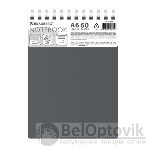 Блокнот МАЛЫЙ ФОРМАТ А6, 60 л., силиконовый гребень, обложка пластик, клетка, BRAUBERG, серый, 117566