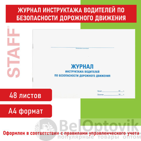 Журнал инструктажа водителя по безопасности дорожного движения, 48 л., картон, офсет, А4 292х200 мм, STAFF, 130264
