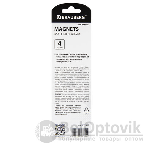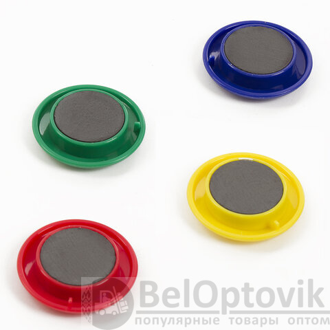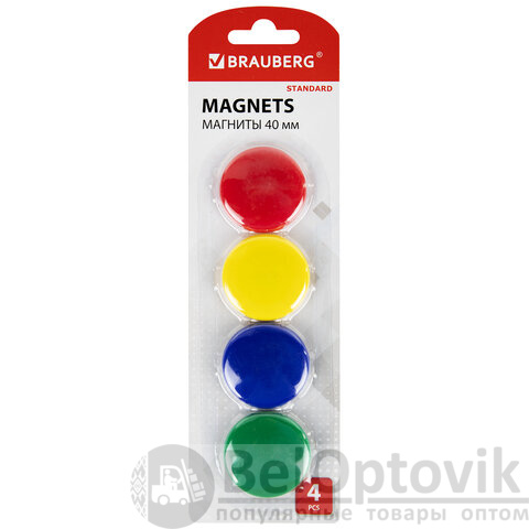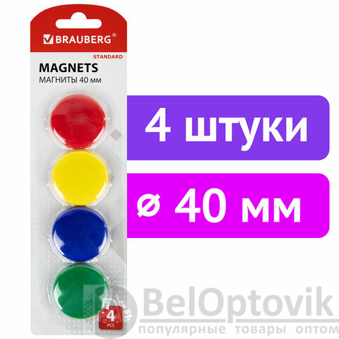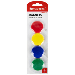 Магниты БОЛЬШОГО ДИАМЕТРА 40 мм, НАБОР 4 шт., ассорти, BRAUBERG "STANDARD", 237470