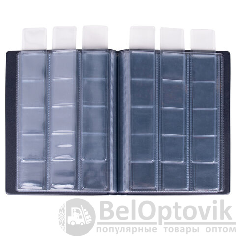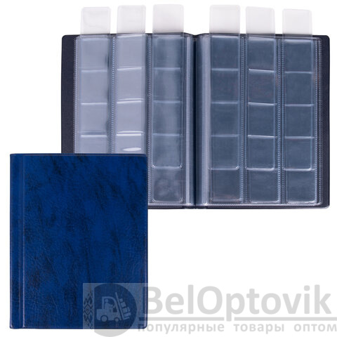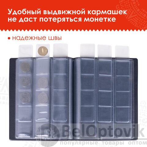 Альбом размером 145х185 мм выполнен из качественного кожзама и представлен в синем цвете. Укомплектован шестью листами-вкладышами с выдвижными карманами. Альбом вмещает 90 монет диаметром до 32 мм. Размер карманов – 30х33 мм, материал листов – ПВХ.