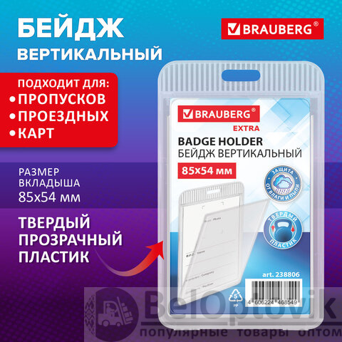Вертикальный бейдж BRAUBERG предназначен для хранения пропусков и карточек сотрудников, ID-карт, проездных и банковских карт.