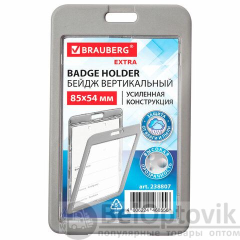 Бейдж вертикальный (85х54 мм), ДВУСТОРОННИЙ, серый, ЗАЩИТА ОТ ВЛАГИ И ПЫЛИ, BRAUBERG EXTRA, 238807