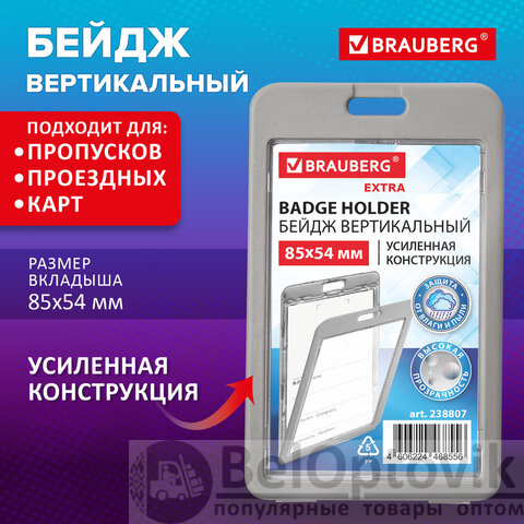 Вертикальный бейдж BRAUBERG предназначен для хранения пропусков и карточек сотрудников, ID-карт, проездных и банковских карт.