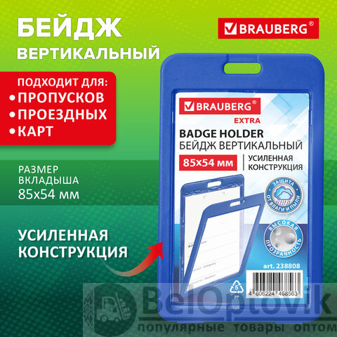 Вертикальный бейдж BRAUBERG предназначен для хранения пропусков и карточек сотрудников, ID-карт, проездных и банковских карт.
