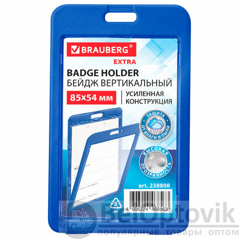 Бейдж вертикальный (85х54 мм), ДВУСТОРОННИЙ, cиний, ЗАЩИТА ОТ ВЛАГИ И ПЫЛИ, BRAUBERG EXTRA, 238808