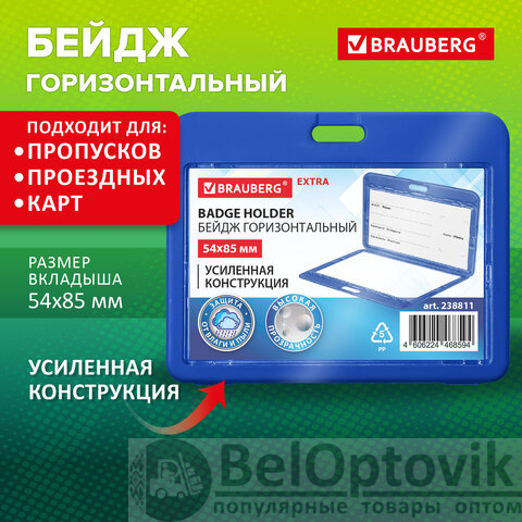 Горизонтальный бейдж BRAUBERG предназначен для хранения пропусков и карточек сотрудников, ID-карт, проездных и банковских карт.