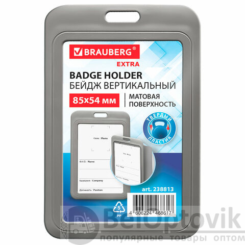 Бейдж вертикальный (85х54 мм), серый, МАТОВАЯ ПОВЕРХНОСТЬ, BRAUBERG EXTRA, 238813