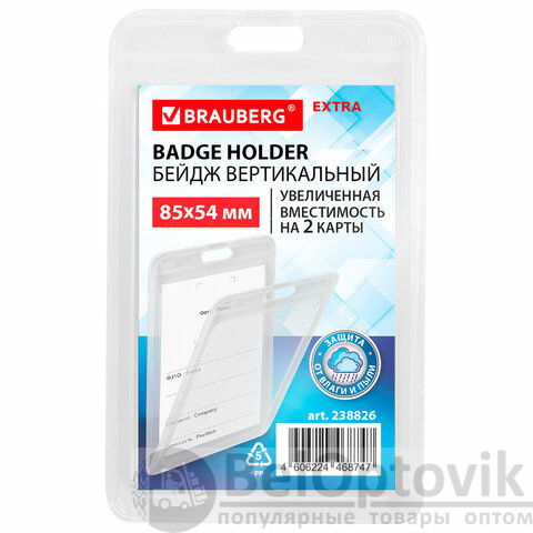 Бейдж вертикальный (85х54 мм) на 2 карты прозрачный, ЗАЩИТА ОТ ВЛАГИ И ПЫЛИ, BRAUBERG EXTRA, 238826