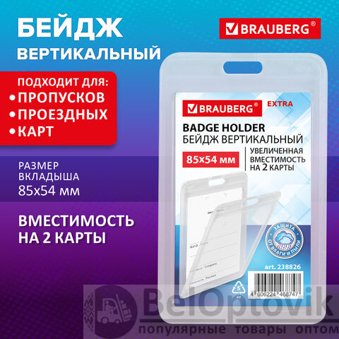 Вертикальный бейдж BRAUBERG EXTRA для хранения пропусков и карточек сотрудников, ID-карт, проездных и банковских карт.