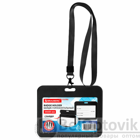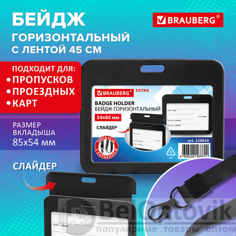 Бейдж горизонтальный (54х85 мм), лента 45 см с карабином, СЛАЙДЕР, черный, BRAUBERG EXTRA, 238834