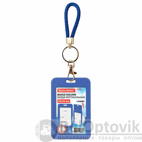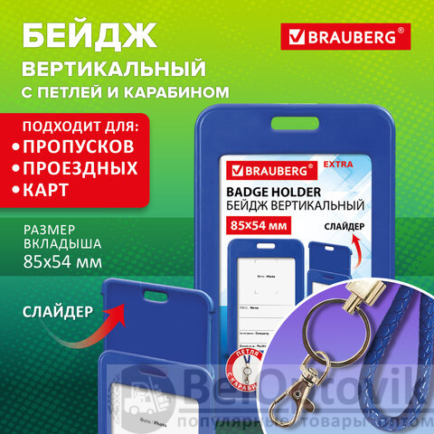 Бейдж вертикальный (85х54 мм), петля с карабином, СЛАЙДЕР, синий, BRAUBERG EXTRA, 238836