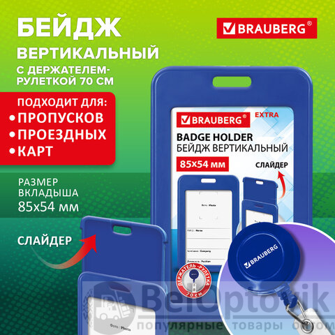 Бейдж вертикальный (85х54 мм), с рулеткой 70 см с клипом, СЛАЙДЕР, синий, BRAUBERG EXTRA, 238844