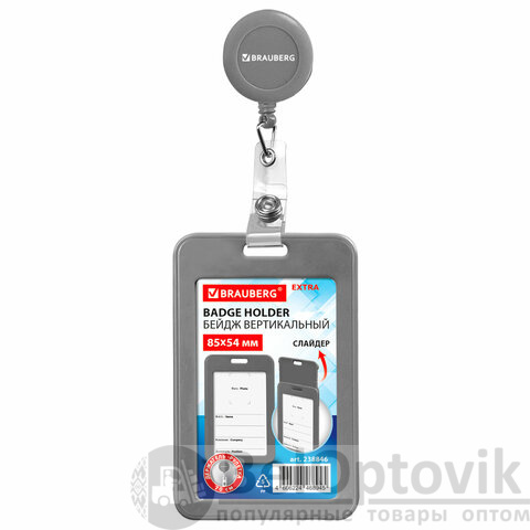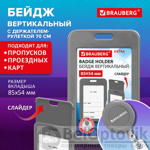 Вертикальный бейдж с рулеткой BRAUBERG для хранения тонких пропусков, карточек, ID-карт, проездных и банковских карт.