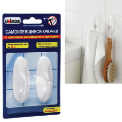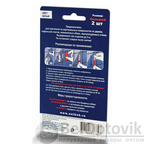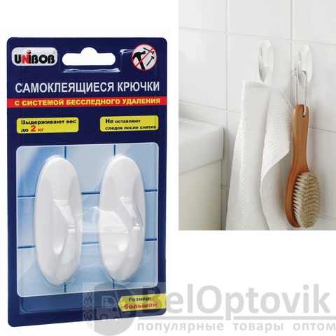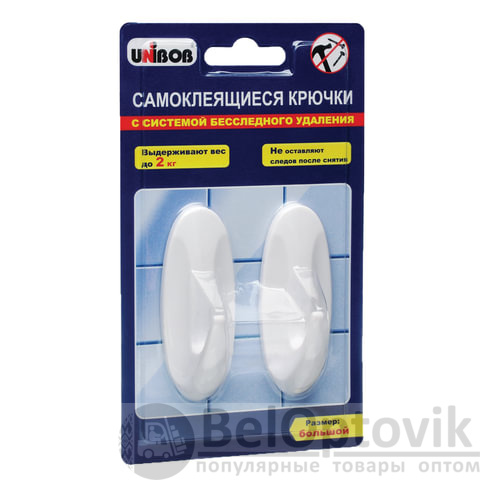 Крючки самоклеящиеся, комплект 2 шт., пластиковые, большие, вес до 2 кг, UNIBOB, белые, блистер, 48999