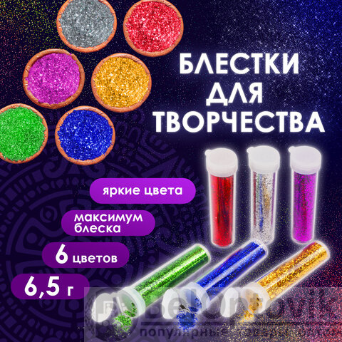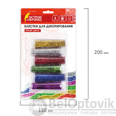 Блестки (глиттер) для декора, поделок, DIY, творчества, оформления, ОСТРОВ СОКРОВИЩ, НАБОР, 6 цветов по 6,5 грамм, блистер, 661550