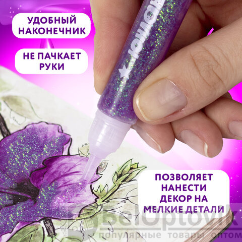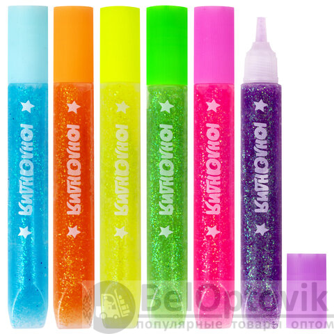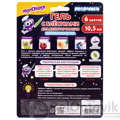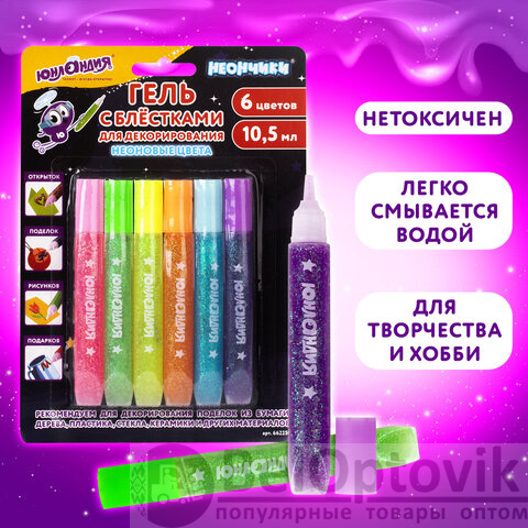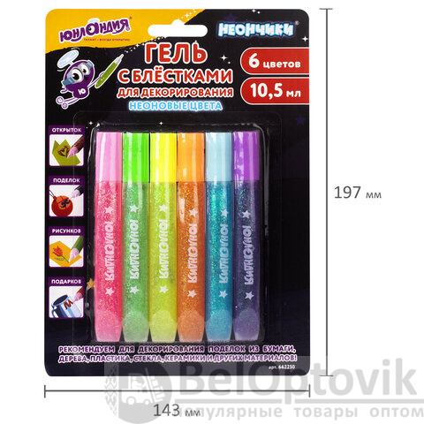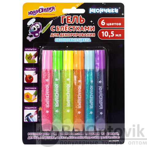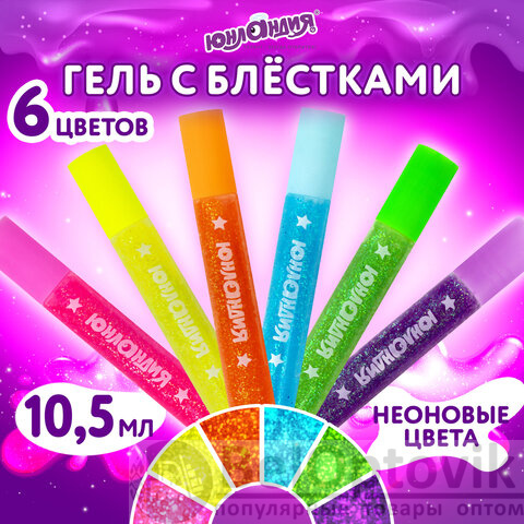 Гель с блестками ЮНЛАНДИЯ "НЕОНЧИКИ", для декора, поделок, DIY, творчества, оформления, 6 цветов по 10,5 мл, блистер, 662250