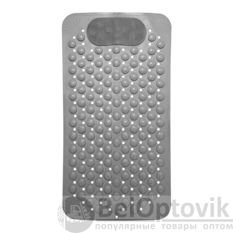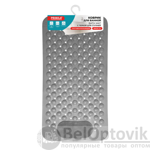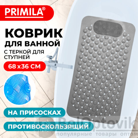 Коврик для ванны противоскользящий с теркой для ступней 68х36см, серый, ПВХ, присоски, PRIMILA, 700389