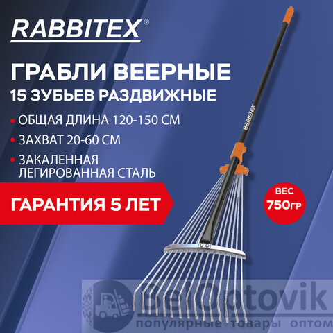 Грабли веерные 15 зубьев раздвижные, захват 20-60 см, ОБЩАЯ ДЛИНА 120-150 см, RABBITEX (РАББИТЕКС) "LONG HANDLE", 700495