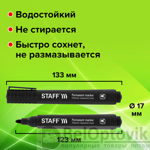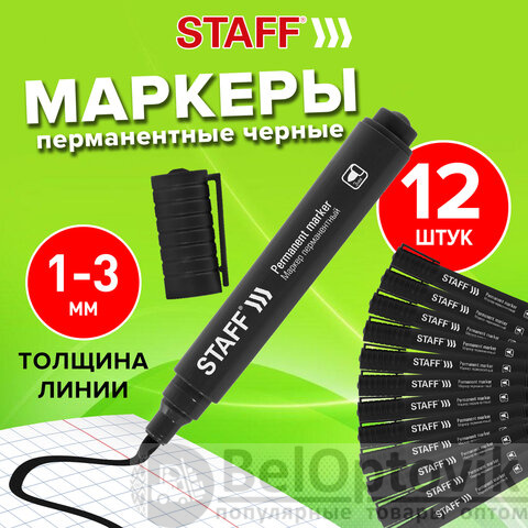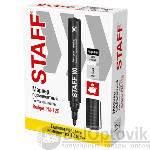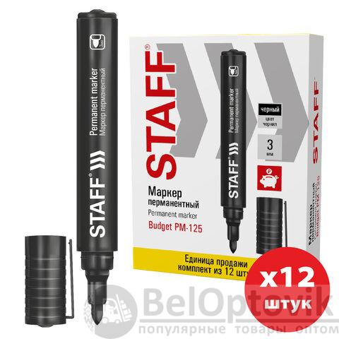 Маркер перманентный STAFF "Basic Budget PM-125", ЧЕРНЫЙ, ВЫГОДНАЯ УПАКОВКА, КОМПЛЕКТ 12 шт., 3 мм, 880598