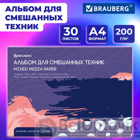 Альбом для смешанных техник, бумага MixMedia 200г/м, А4 30л, склейка, BRAUBERG ART PREMIERE, 116961