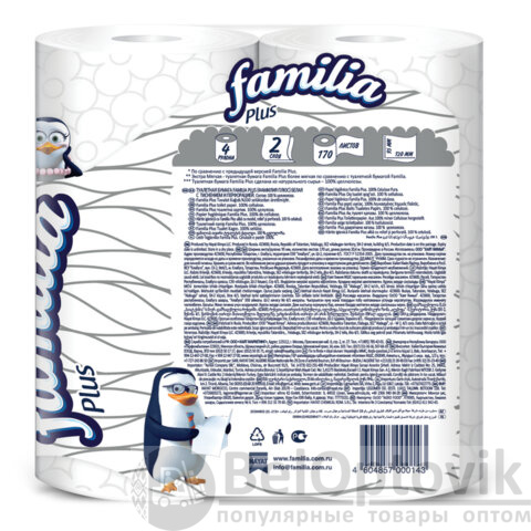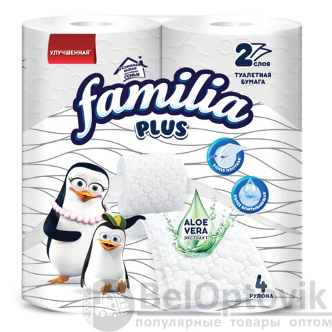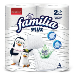 Бумага туалетная бытовая, спайка 4 шт., 2-слойная (4х20,4 м), FAMILIA PLUS, белая, 5080758