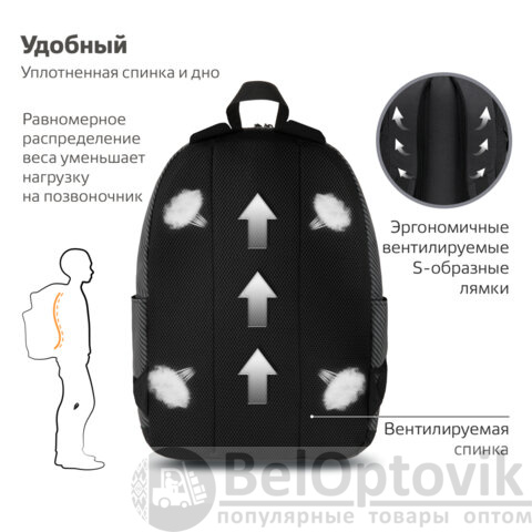 Плотная вентилируемая спинка рюкзака обеспечивает удобное прилегание к спине, способствуя равномерному распределению нагрузки, делая эту модель комфортной и безопасной для ежедневного использования.