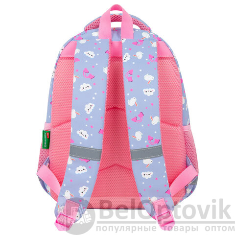 Яркая этикетка расположена на передней стороне рюкзака, делая его более заметным на полке магазина, а информация в ней отражает главные потребительские свойства, помогая покупателю принять решение о покупке.