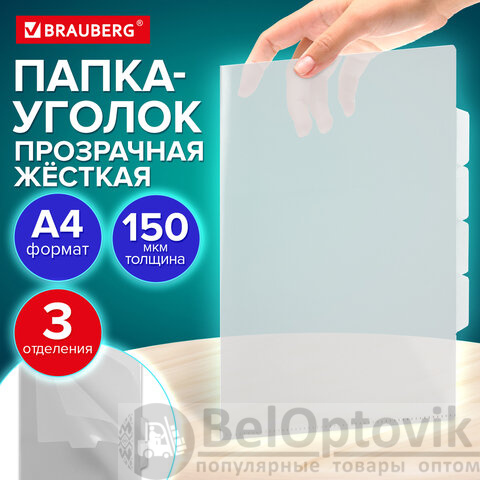 Папка-уголок 3 отделения, жесткая, А4, BRAUBERG "SPECIAL", прозрачная, 0,15 мм, 273062