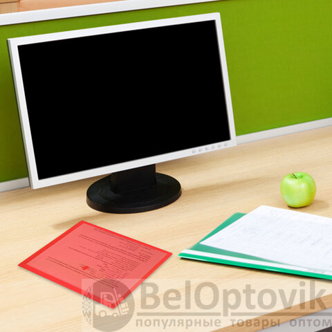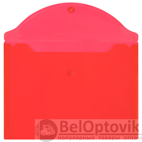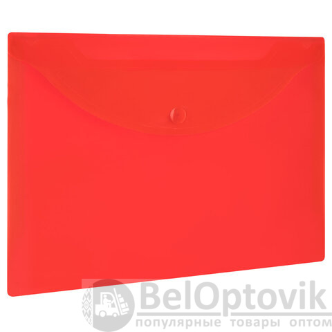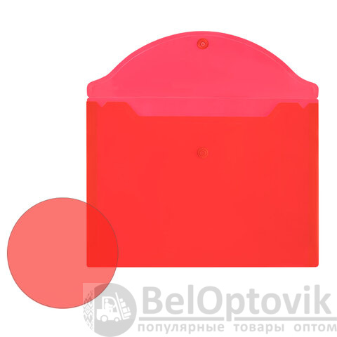 Папка-конверт с гладкой фактурой формата А5 изготовлена из плотного прозрачного пластика красного цвета толщиной 150 мкм. Закрывается на защелку-кнопку, что делает удобным частое использование и обеспечивает быстрый доступ к ее содержимому. Папка способна вместить до 100 листов стандартной плотности.