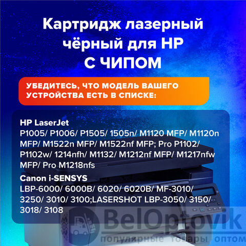 Совместимые лазерные картриджи SONNEN – это оригинальное качество по доступной цене. Данная модель содержит ЧИП, подходит для лазерных принтеров и МФУ: HP LaserJet P1005/P1006/P1505/1505n/M1120 MFP/M1120n MFP/M1522n MFP/M1522nf MFP; Pro P1102/P1102w/1214nfh/M1132/M1212nf MFP/M1217nfw MFP/ Pro M1218nfs; Canon i-SENSYS LBP-6000/6000B/6020/6020B/MF-3010/3250/3010/3100;LASERSHOT LBP-3050/3150/3018/3108.