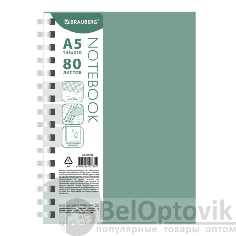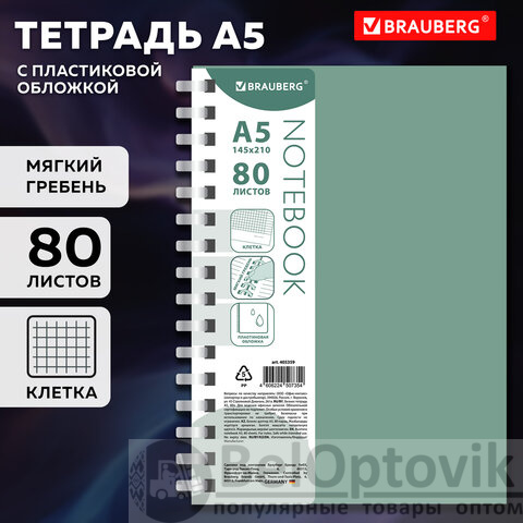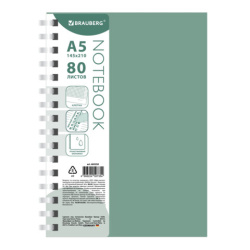 Тетрадь обложка пластик, А5 80 л., гребень мягкий (силиконовый), клетка, BRAUBERG, зеленая, 405359