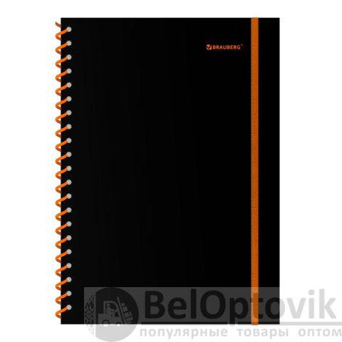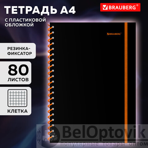 Тетрадь обложка пластик, А4 80 л., спираль пластик, резинка, клетка, BRAUBERG, черный/оранжевый, 405382
