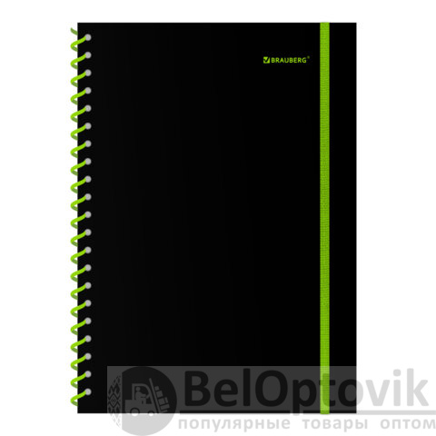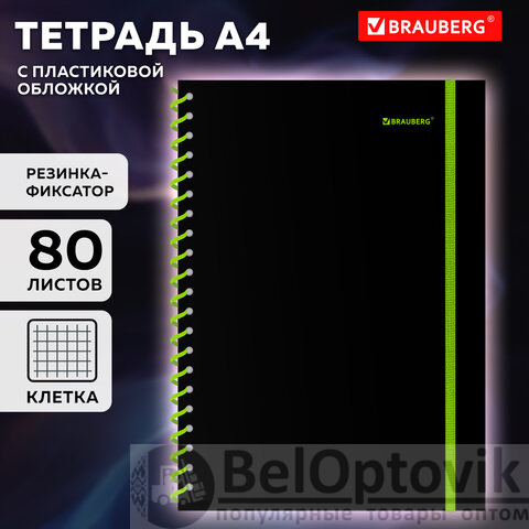 Тетрадь обложка пластик, А4 80 л., спираль пластик, резинка, клетка, BRAUBERG, черный/зеленый, 405383