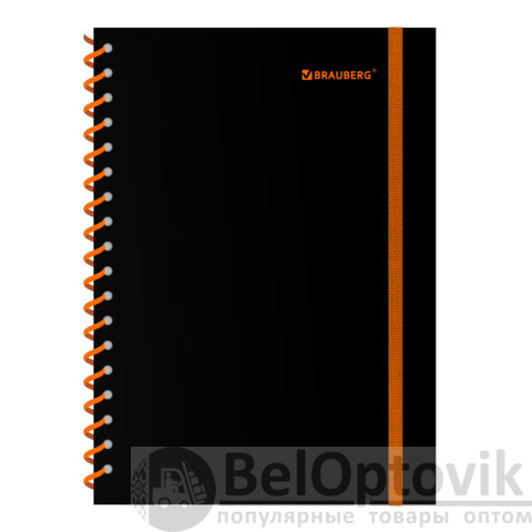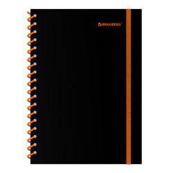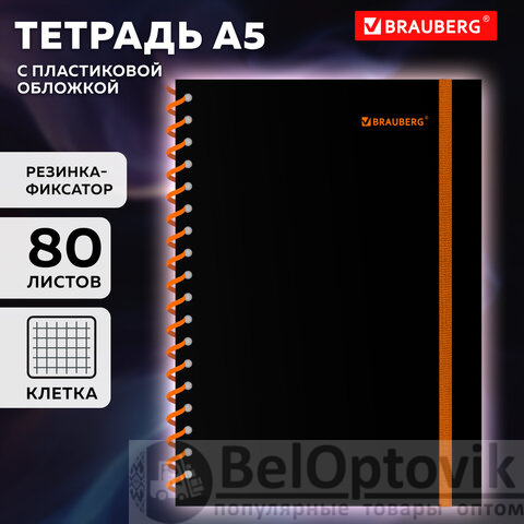Тетрадь обложка пластик, А5 80 л., спираль пластик, резинка, клетка, BRAUBERG, черный/оранжевый, 405386