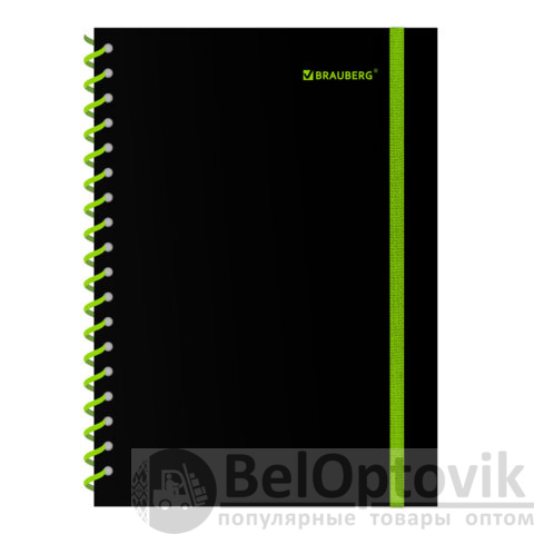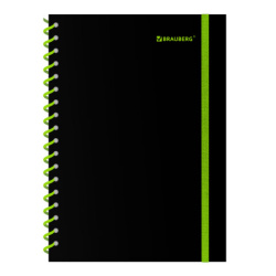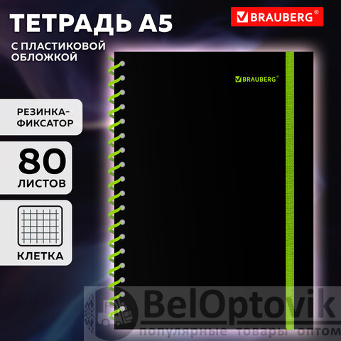 Тетрадь обложка пластик, А5 80 л., спираль пластик, резинка, клетка, BRAUBERG, черный/зеленый, 405387