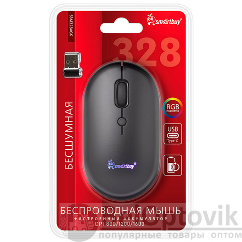 Мышь беспроводная бесшумная SMARTBUY 328AG, USB, 3 кнопки + 1 колесо-кнопка, черный, SBM328AGK