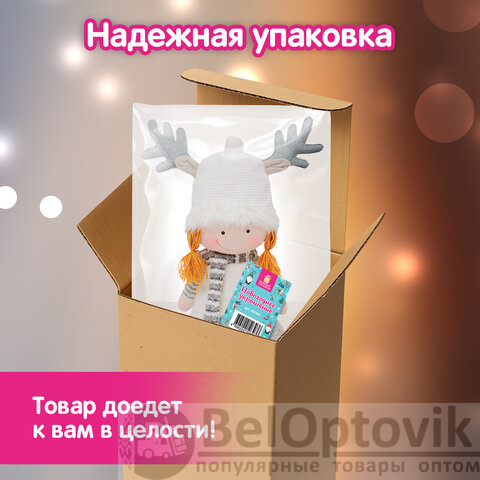 Украшение упаковано в пакет с клейким краем, а затем в прочный гофрокороб. Материал – полиэстер, металл. Размер с собранными ножками – 60см, размер с вытянутыми ножками – 75 см.