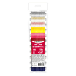 Цвета ниток в наборе могут незначительно отличаться от представленных на фото. В набор входит 11 катушек различных цветов в намотке 120 метров. Материал состоит из прочной армированной нити толщиной 45 ЛЛ.