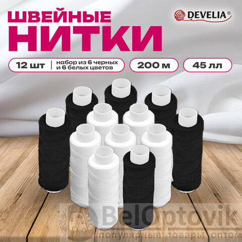 Нитки швейные 45ЛЛ 200 м, полиэстер, НАБОР 12 штук, 6 белых/6 черных, DEVELIA (Девелиа), 609620