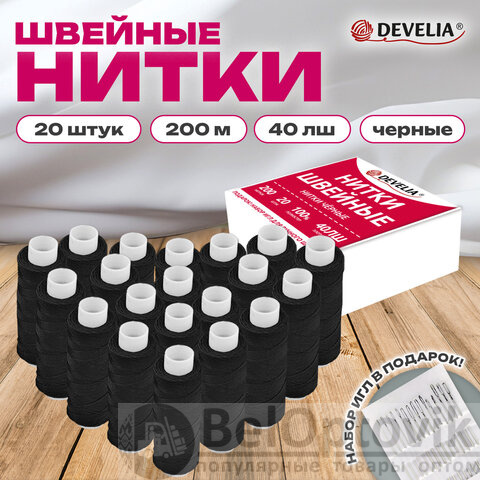 В набор входит 20 катушек 40ЛШ черного цвета в намотке 200 м. и набор игл для ручного шитья (15 штук). Поставляются в картонной коробке.