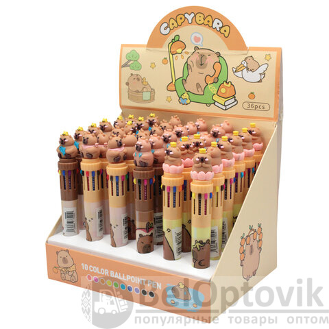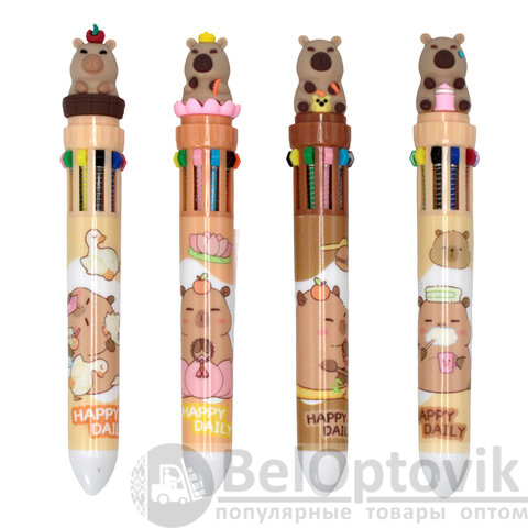 Ручка многоцветная с топпером шариковая 10 ЦВЕТОВ "Капибара". Модель удобна в использовании, экономит место в пенале или на рабочем столе, позволяет всегда иметь под рукой набор основных цветов для письма и выделения записей.