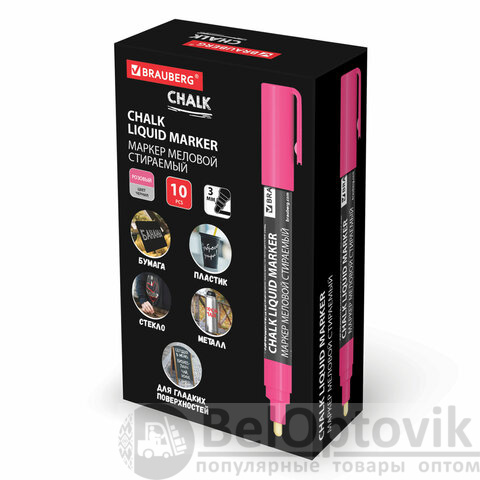 Стираемый меловой маркер BRAUBERG "CHALK" предназначен для создания рисунков и надписей на гладких и прозрачных невпитывающих поверхностях (например, зеркалах, стекле, меловой пленке). Подходит для школьных занятий, идеальны для детского творчества!